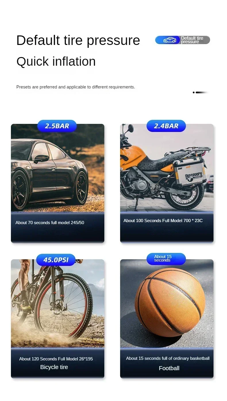 Fast inflating & Easy operation This auto tire air compressor can inflate your standard car tires in seconds. Plug it into the 12V power outlet in your car and attach the stem to the tire valve. A simple press on the car air compressor and it will do all the work for you.