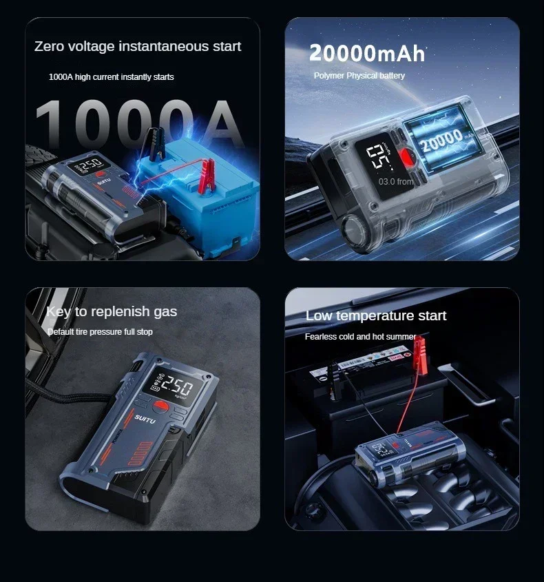4 In 1 Car Jump Starter with Air Compressor 20000mAh Portable Booster Charger 1000A Powerful Car Battery Starting Device